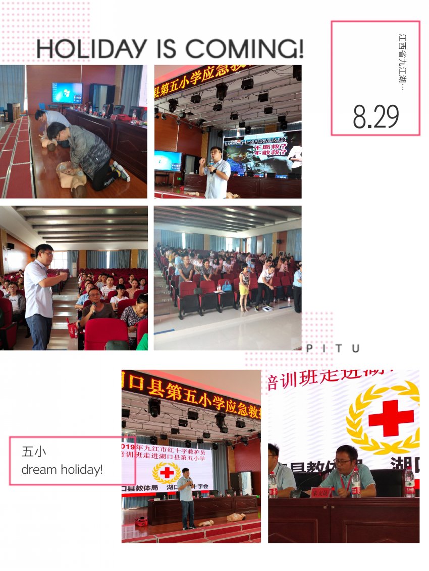 为提高学校师生的紧急救护意识,提升应对突发灾难和意外伤害的自救与互救能力,8月29日下午,由湖口县教体局、湖口县红十字会联合、第五小学举办的应急救护员培训活动在第五小学多功能报告厅开展。九江市红十字会救护培训中心讲师钱逢鑫、县红十字会专职副会长朱文晟、第五小学校长陈永腾参加了此次培训活动。